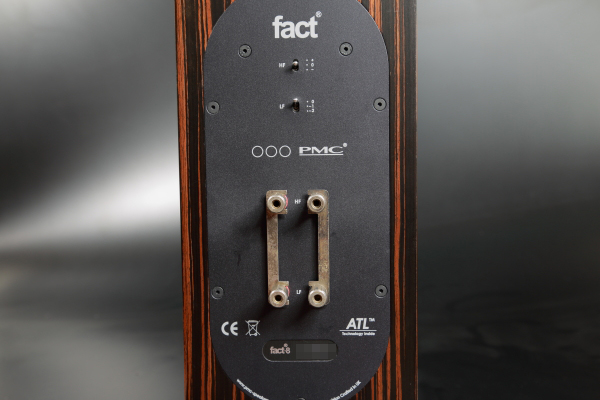 轉到喇叭背面,第一個看到的是霧銀色喇叭端子,這是PMC特別訂制的元件,包含跳線接片在內,導體以銅為主,表面經過鍍銀處理,所以看起來才會是霧銀色的。在喇叭端子上方還有兩個小小的撥桿,分別負責高音(+2dB、Flat、-2dB)、低音(Flat、-3dB、-6dB)調整,畢竟每一位用家的聆聽空間大小、吸音、反射條件都不相同,有了這個增減補償的功能,讓Fact.8更容易融入空間之中,也讓用家更容易調整出自己喜歡的音色,節省許多力氣。