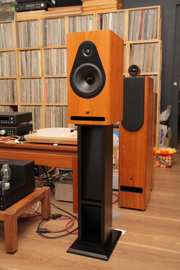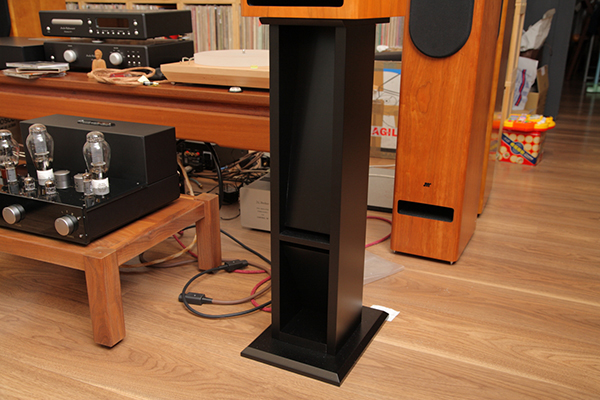 這是JMR自家的Magic Stand II喇叭架,其特殊之處便是中間用了兩塊斜板構成空腔,形成兩個諧振器,然后針對100Hz至400Hz的低頻進行處理,其結果就是讓50Hz以下低頻的頻率響應變得更平直,聽感上低頻也會變得更厚實。