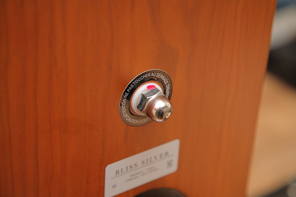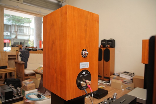單體部分,Bliss Silver使用一顆1.1吋絲質軟半球高音,與一顆7吋碳纖維/紙盆中低音單體。除了從一開始的單體挑選,便要求左右聲道要精確匹配外,Bliss Silver還配備了一項非常特殊的設計。你可以看到Bliss Silver背面有一顆大型螺帽,它的位置正好位在中低音單體的正后方。原來在這顆螺帽后方是一根不鏽鋼軸,直接穿過音箱并緊鎖在單體磁鐵的中心,也就是說,不鏽鋼軸提供給單體框架另一個支撐力道,并使整個音箱結構變得更為強固。此外,藉由旋轉螺帽,可以精確調整不鏽鋼軸的張力,進而準確控制音箱的震動,以達到最好的優化狀態。那這顆螺帽可不可以自己轉呢?我猜是可以,因為原廠在螺帽上標了個紅點,用以表示出廠時不鏽鋼軸的鬆緊度,如果調整后聲音不太對勁,還是可以轉回原來的位置。