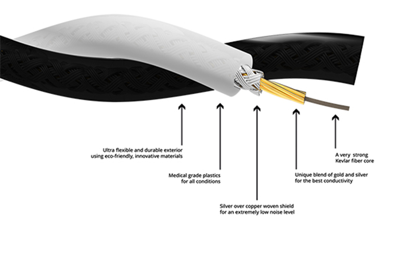 Duet耳機升級線不僅外型與以往Crystal Cable不同,內部結構與導體也有大幅改變。Duet導體并未采用同軸單芯銀線,而使用特殊的高純度金銀絞線,圍著一股Kevlar軸心進行絞繞。此金銀導體先以一層鍍銀銅線編織網嚴密包覆,可有效隔離外界雜訊,最外層再包裹一層非常柔軟又耐用的絕緣層,形成主要導體。Duet耳機線便是依此主導體為基礎制作成各類升級線,并可接受各種規格的接頭與長度訂制。